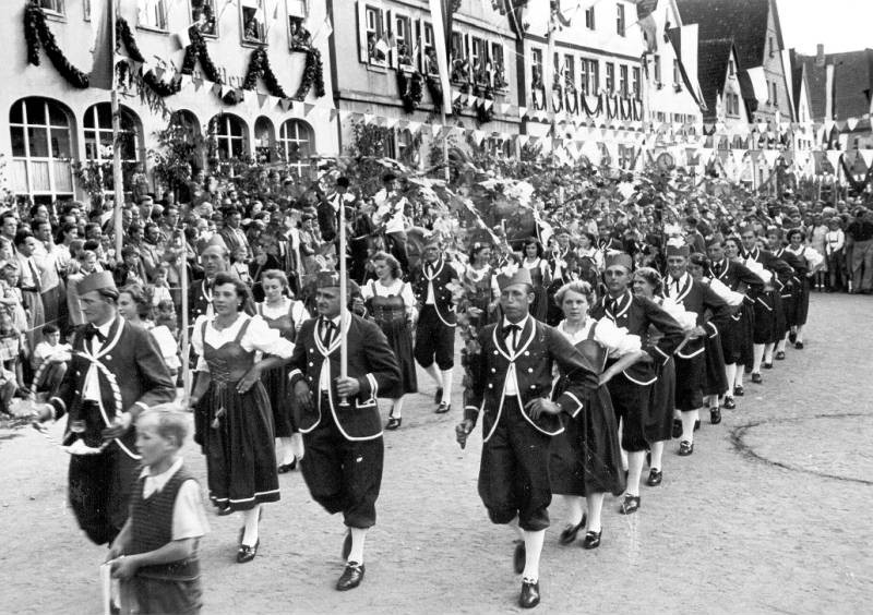 Anhand noch vorhandener Exemplare aus der Anfangszeit 1924 ließ der Verein für Handel- und Handwerk neue Trachten für Männer und Frauen fertigen, die zugehörigen Stoffe stellte der damalige Textilladen Schäfer zur Verfügung. So rundete die Aufführung des Schäfflertanzes die Feierlichkeiten zur Wiedereinweihung der Stadtpfarrkirche ab. Dieses Ereignis wurde zum Anlass genommen, die Kirchweih generell für beide Konfessionen am Sonntag nach Mariä Himmelfahrt zu feiern, wo der Schäfflertanz zur Aufführung kommen sollte. Leider schlief der Schäfflertanz dann wieder ein. Es ist nicht bekannt, ob dies auf das permanent schlechte Wetter das in den 1950iger Jahren an der Kirchweih herrschte zurückzuführen ist oder ob sich keiner mehr einer neuerlichen Einstudierung annahm.