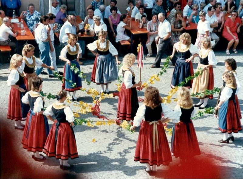 Nun erfolgt eine Pause in der der Oberschäffler den Reifen mit einem gefüllten Weinglas schwingt, ohne einen Tropfen des kostbaren Getränkes zu verschütten. Darauf folgend bringt er das Glas zu seiner Oberschäfflerin und lädt sie zu einer kleinen, fränkischen Erfrischung ein.