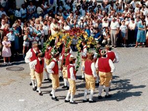 Weiter geht der Tanz nun mit der Rosette. Die Tänzer lösen sich auf in zwei mit den spitzen zusammentreffenden Dreiecken und marschieren auf Ihren Oberschäffler zu. Sie bilden eine Art Stern um den Oberschäffler und auf Zeichen machen Sie einen Schritt nach außen um die Bögen zu senken. Nach einer Runde erfolgt dasselbe noch einmal. Nun lösen sie sich wieder zum Ausmarsch in ihre Dreiecke auf.